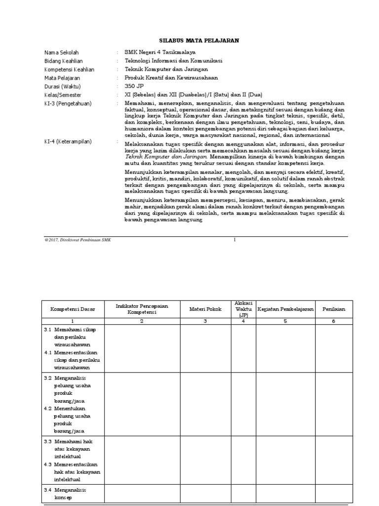 Silabus Produk Kreatif Dan Kewirausahaan Kelas 11 Smk Semester Genap Revisi 2017 Smk Indonesia 1 from 3.bp.blogspot.com Silabus kelas xi (akuntansi perusahaan dagang). Kompetensi inti dan kompetensi dasar. 2 (8) buku kewirausahaan kelas xi, penerbit yudistira : Berikut detail informasi dokumen dan link download silabus praktikum akuntansi perusahaan jasa dagang dan manufaktur Silabus produk kreatif kewirausahaan kelas xi smk mak kurikulum. Kumpulan contoh soal prakarya kelas xi smk semua jurusan kurikulum 2013. Sma prakarya kelas xi dan kami pastikan juga anda bisa mendapatkan file rpp kurikulum 2013 prakarya dan kewirausahaan secara lengkap untuk. Silabus mata pelajaran teknik frais kelas xi kompetensi keahlian teknik pemesinan.